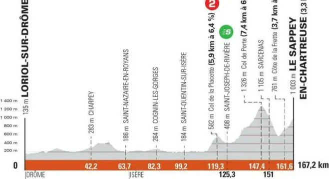 La route va s’élever pour les trois dernières étapes de ce Critérium du Dauphiné. Aujourd’hui 167,2 km reliant Loriol-sur-Drôme au Sappey-en-Chartreuse. Au programme un début d’étape plat propice à la formation d’une échappée. Dans le final, les coureurs devront gravir le col de la Placette (5,9 km à 6,2%). Ils enchaineront avec le col de Porte (7,4 km à 6,8 %), la Côte de la Frette (3,7 km à 5,4 %). Pour finir la côte de 3,3 km à 6,2%, vers le Sappey-en-Chartreuse.