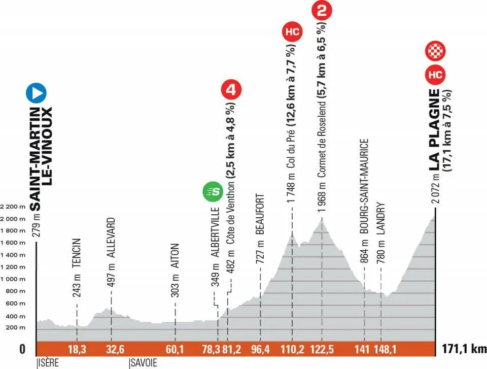 Cette étape endosse parfaitement le rôle d’étape reine. Empruntant l’enchaînement, Col du Pré (HC), Cormet de Roselend (2e) de la 108e Grande Boucle, le finale aura lieu en revanche à La Plagne et non du côté de Tignes. Avec une montée longue de 17,1 km et avec un dénivelé moyen de 7,5%, ce sera le meilleur des grimpeurs qui s’imposera à plus de 2000 m d’altitude. Les écarts risquent d’être conséquents au vu du menu servi par ASO.
