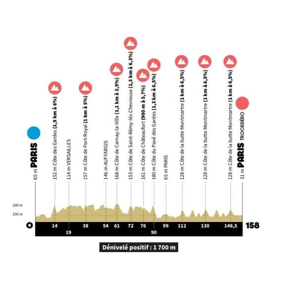 C'est un parcours pour costaud qui a été dévoilé par les organisateurs des Jeux, 2800 mètres de dénivelé et pas moins de 14 bosses. Un dernier circuit autour de la butte de Montmartre (1 km à 6,5%). Une côte a escaladé 3 fois dont une dernière fois à 9,5 kilomètres de l'arrivée. Un parcours taillé pour les sprinteurs à l'aise dans les bosses, ce qui fait de Wout Van Aert ou encore Mathieu Van der Poel les immenses favoris. Le départ aura lieu à la Tour Eiffel pour une arrivée au Trocadéro.