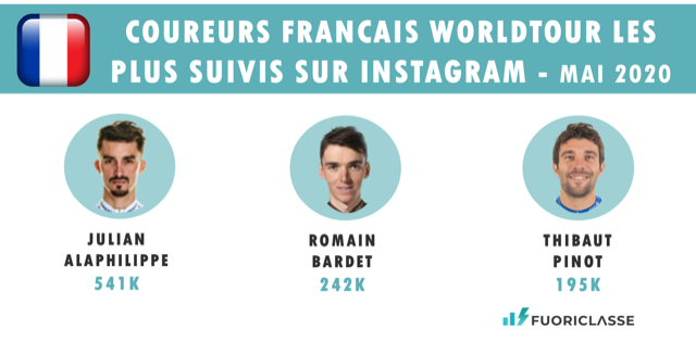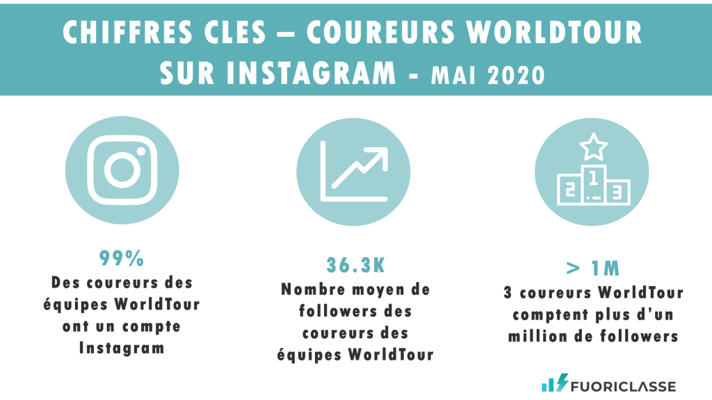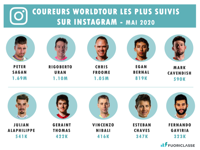 La popularité des coureurs sur Instagram ne cesse de grimper et la communauté cyclisme s'y est fortement développée. La preuve en est puisqu'on compte en moyenne 36 300 abonnés sur le compte de chaque coureur World Tour. Le podium lui se joue même au dessus du million d'abonnés… Superstar. Toutefois le cyclisme est encore très en retard sur des sports comme le foot et la NBA avec des comptes à 30 millions d'abonnés comme celui d'Antoine Griezmann où de Stephen Curry.