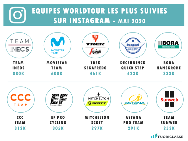 Si le top 10 est à peu près cohérent, on peu s'étonner que CCC et EF soient devant Mitchelton et Astana. Un étonnement encore plus prononcé lorsque l'on voit l'absence des équipes françaises ou encore de la Jumbo-Visma. AG2R compte 153 000 followers, ce qui les place au 15e rang, juste devant FDJ 17e avec 91 000 followers et Cofidis 18e avec 76 000 followers. Si l'on compare, La team Novo Nordisk, première équipe Conti Pro compte elle 93 000 followers. Les équipes françaises ont donc encore du boulot sur la communication.