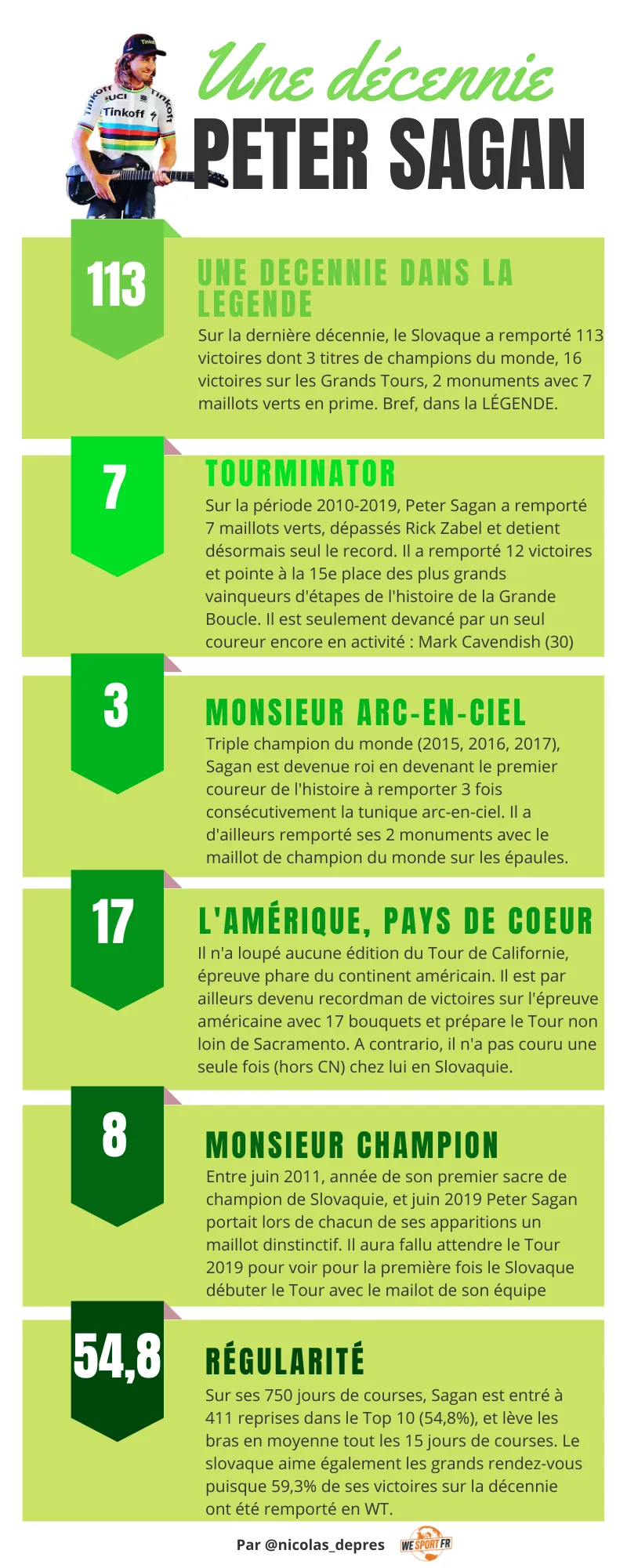 Victoires, maillots verts, titres mondiaux, monuments … Peter Sagan (Bora-Hansgrohe) est rentré dans la légende du cyclisme lors de la dernière décennie. Avec ses 113 victoires sur la période 2010-2019, il est la deuxième le plus victorieux où seul André Greipel (Israel Start-up) le devance. L’histoire du sprinter slovaque sur les dix dernières années en une infographie.