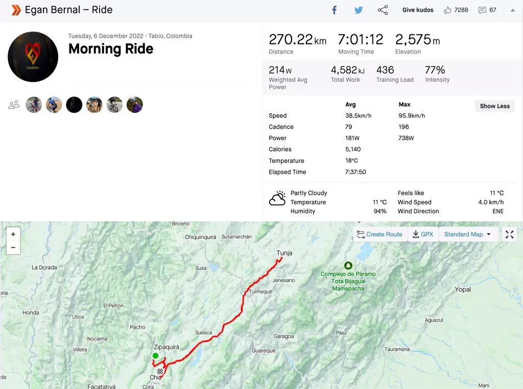 Il a arrêté le chrono à sept heures et une minute, avec 270,22 kilomètres parcourus à une vitesse moyenne fulgurante de 38,5 km/h, une puissance normalisée de 214 watts et une consommation d’énergie de plus de 1075 cal.