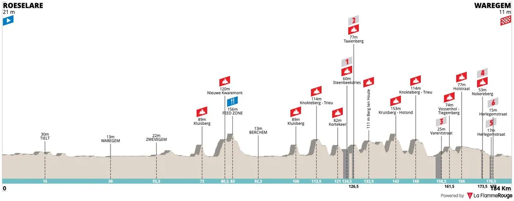 Le départ de la classique World Tour « À travers la Flandre » est donné à 12h26. Cette course flandrienne contient 184 km. Personne ne semble vouloir partir s’échapper, le peloton roule ensemble à un rythme élevé en effectuant 50 km dans la première heure de course. C’est au sommet du Nouveau Quaremont qu’un coureur se détache. Il s’agit de Ethan Hayter de la formation Ineos Grenadiers qui part en solitaire à 102 km de l’arrivée. Un trio de tête est à l’avant de la course en étant rejoint par Florian Vermeersch qui incarne la Lotto Soudal et Jelle Wallays de l’équipe Cofidis.
