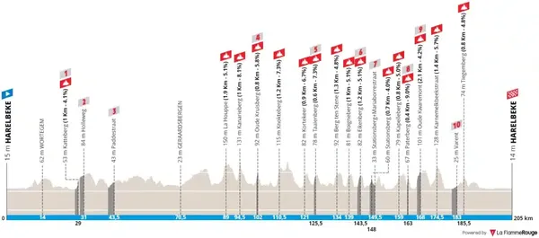 La E3 Saxo Classic totalise environ 204 kilomètres, avec dix-sept collines et cinq secteurs pavés. Le parcours est une copie conforme de celui de l’année dernière. La “semaine flamande” commence par une montée en puissance progressive. Le Katteberg, au kilomètre 28, est le seul obstacle de la première heure, tandis que La Houppe et le Kanarieberg apparaissent une soixantaine de kilomètres plus loin.