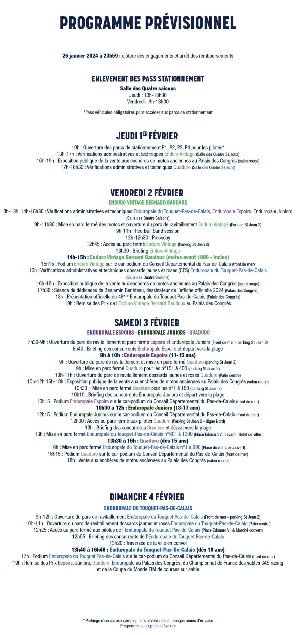 L'Enduropale du Touquet débute ce vendredi 2 février, mais la première grosse journée aura lieu le samedi 3, avec une journée de course. Le vendredi après-midi lieu une épreuve Enduro Vintage avec des motos datant d'avant 1996. La remise des prix aura lieu le dimanche soir à partir de 19 h 00.
