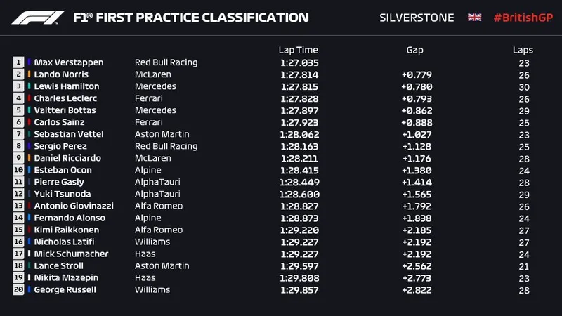 Max Verstappen (Red Bull) a signé le meilleur chrono de la première séance d’essais du GP de Grande-Bretagne. Il devance les Britanniques Norris (McLaren) et Hamilton (Mercedes).