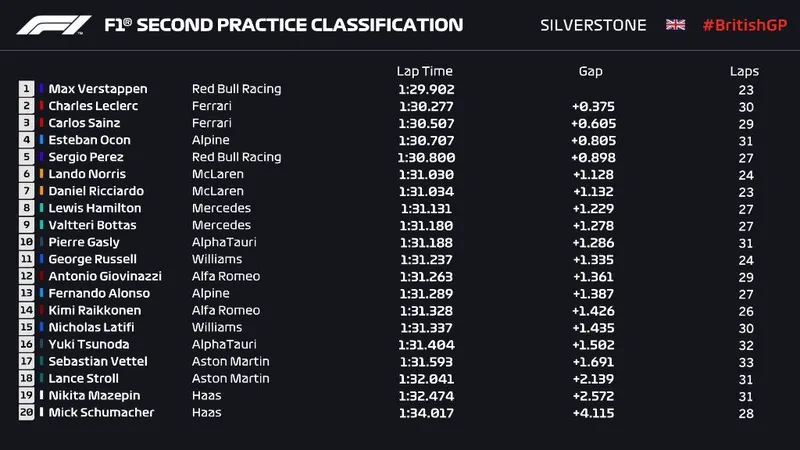 Max Verstappen remet les pendules à l’heure. Le pilote Red Bull a signé le meilleur temps de la dernière séance d’essais libres du GP de Grande-Bretagne en 1:29.902. Il devance les deux pilotes Ferrari, Charles Leclerc (2e, +0.375 s) et Carlos Sainz (3e, +0.605 s). Esteban Ocon a été le meilleur Français du jour en classant son Alpine à la 4e place (+0.805 s). Lewis Hamilton a signé quant à lui le 8e temps (+1.229 s).