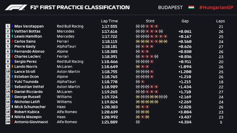 En signant meilleur temps de la matinée en 1:17.555, Verstappen montre qu’il n’a subi aucune séquelle de son accident de Silverstone. Le Batave devance les deux pilotes Mercedes Bottas (2e à +0.061 s) et Hamilton (3e à +0.167 s). Si dans un premier temps le pilote Red Bull s’est concentré sur l’utilisation des gommes les plus dures, peu après la mi-séance Verstappen est ressorti avec les gommes tendres pour signer le meilleur chrono.