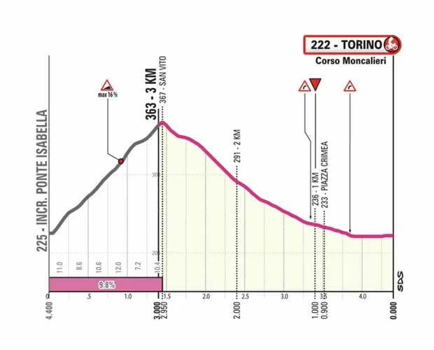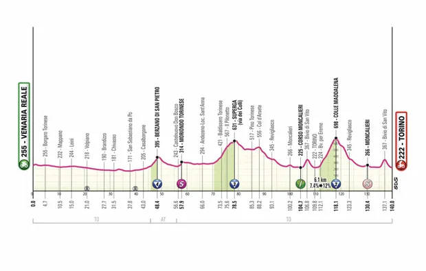 Concernant la montagne, le peloton empruntera à mi-parcours la montée de Superga. Une montée de 7,9 kilomètres à 4,5% de pente moyenne classée en 3e catégorie. La dernière ascension sera la montée du Colle Maddalena. Le sommet est situé à 22 kilomètres de l’arrivée. La montée est une montée régulière de 6,1 kilomètres à 7,4% de moyenne.