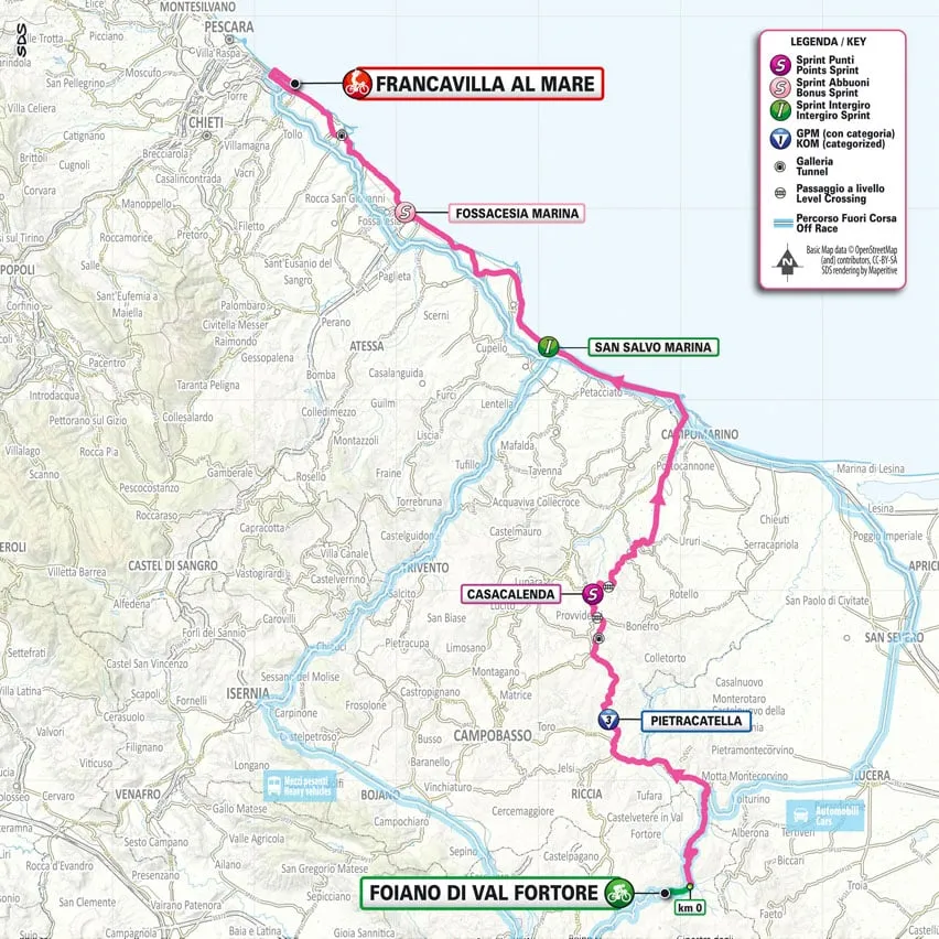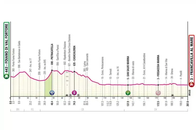 Ce mercredi le peloton retrouve des routes plates. Une étape destinée au sprinteur entre Foiano di Val Forte et Francavilla al Mare (207 km). Une étape longue ne regroupant qu’une seule ascension répertoriée.