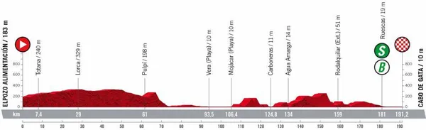 Avec un relief très limité et une tendance légère à la descente sur le premier tiers de course, le peloton va ensuite se livrer à une promenade (qui pourrait rapidement évoluer) le long de la Mer Méditerranée. De Cala Panzo à Carboneras en passant par Garrucha, les coups de vent pourraient secouer une étape promise aux sprinteurs avec une ligne droite finale très longue pour déboucher sur la ligne d’arrivée dans un sprint sur le plat à Cabo de Gaya.