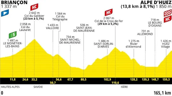 Les coureurs atteignent Saint-Jean-de-Maurienne au kilomètre 80,5 et c’est là que commence le Col de la Croix de Fer. Il s’agit d’un géant de 29 kilomètres de long avec une pente moyenne de 5,2%. Cette statistique est toutefois trompeuse, car il s’agit d’une ascension extrêmement irrégulière. La première partie comporte un certain nombre de rampes à deux chiffres, ainsi que des descentes. Les 6 derniers kilomètres de la Croix de Fer sont plus réguliers avec une pente moyenne de 7,6 %. Une descente de près de 30 kilomètres mène à Allemond et, après 10 kilomètres sur le plat, la Grande Finale se présente. La montée vers la station balnéaire de l’Alpe d’Huez est longue de 13,8 kilomètres, comporte 21 épingles à cheveux et présente une pente moyenne de 8,1 %. La rampe la plus dure, à 11,5 %, apparaît à près de 4 kilomètres de l’arrivée.