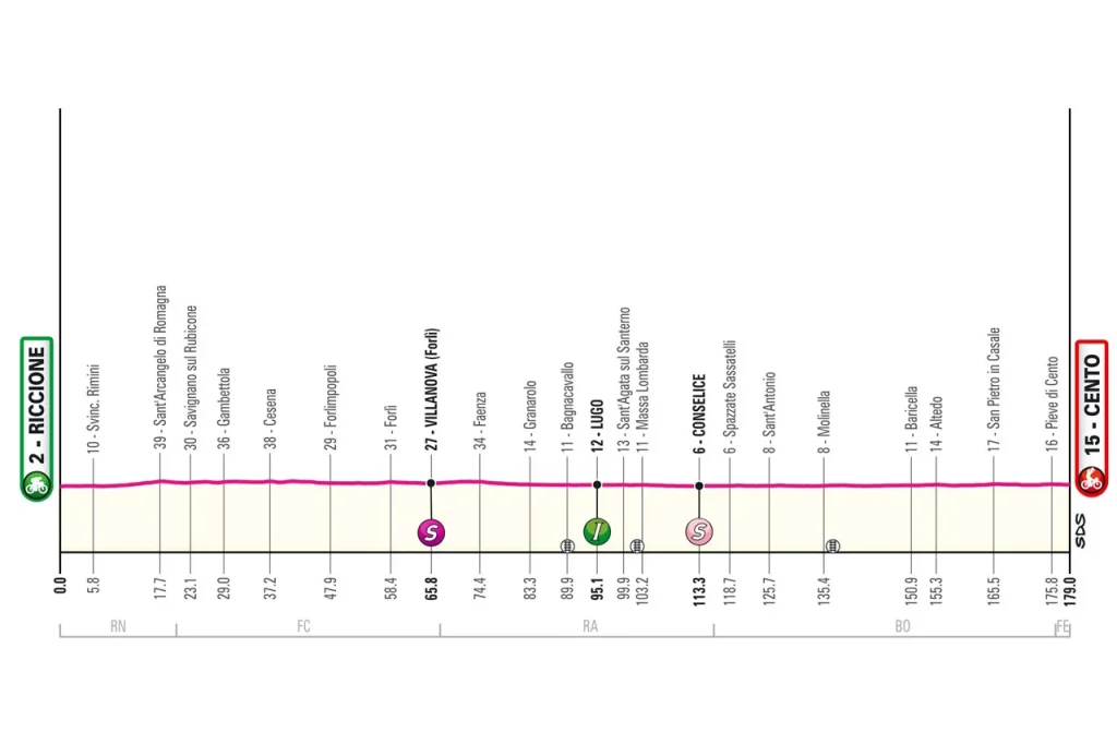 La plus grosse difficulté du jour sera sûrement un pont d'autoroute entre Riccione et Cento (179 km). Ce vendredi il n'y aura que 13 mètres de dénivelé positif pour une étape promis aux sprinteurs. Après une étape de folie la veille remportée par Julian Alaphilippe, le peloton pourra souffler avant le menu costaud du week-end.