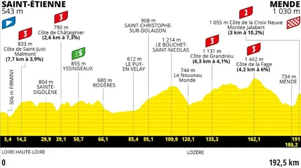 La 14e étape du Tour de France part de Saint-Étienne pour une arrivée exigeante à l’aéroport de Mende. Le parcours, qui demande beaucoup d’énergie, totalise 192,5 kilomètres.