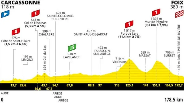 Le final des deux dernières courses vers Foix était identique. Après avoir franchi le Mur de Péguère, une montée de 9,3 kilomètres à 7,9%, les coureurs s’envolent pour une descente de 27 kilomètres jusqu’à la ligne de Foix. Le Mur de Péguère culmine à 1 375 mètres et l’arrivée se situe 1 000 mètres plus bas.