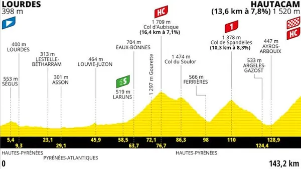 La dernière épreuve de haute altitude du Tour de France est une course de 143,2 kilomètres entre Lourdes et Hautacam. Le Col d’Aubisque et le Col de Spandelles servent d’ascensions intermédiaires avant la montée vers la station de ski, longue de 13,6 kilomètres et d’une moyenne de 7,8 %.
