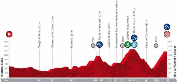 - Les coureurs parcourront 192 km avec trois difficultés répertoriées au programme, la première étant l’Alto de la Despera (3.7km à 9,4%), la seconde la première montée de l’Alto de Piornal (13.5km à 5%) et enfin le second versant monté au sommet duquel sera jugé l’arrivée qui a exactement les mêmes caractéristiques.