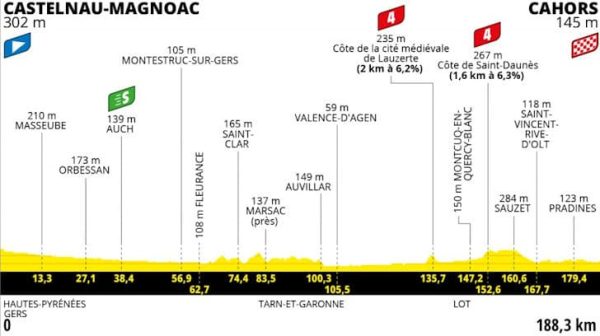 Avec 188,3 kilomètres, la 19e étape du Tour de France se déroule sur des routes plates de Castelnau-Magnoac à Cahors. Le parcours se dirige vers le nord, loin des Pyrénées qui ont dominé les jours précédents.
