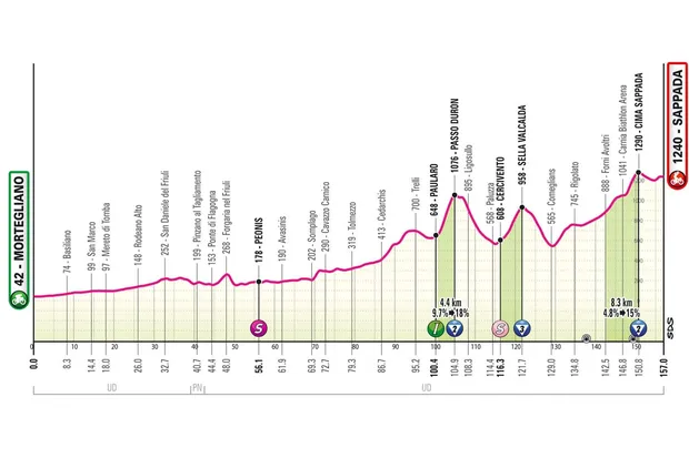 Par la suite le peloton enchainera sur la Sella Valcalda (7,6 km à 5,6 %). Une montée plus longue et plus douce. Les coureurs enchaineront après avec une descente avant de remonter vers la dernière ascension du jour le Cima Sappada (7,5 km à 5,4 %). Une montée irrégulière avec un sommet qui ne sera pas la conclusion de l’étape. Les coureurs devront encore parcourir 7 kilomètres sur un final avec une dernière montée à 2 kilomètres de la ligne à 5,4% de moyenne.