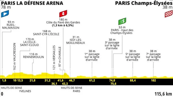 Les coureurs enfoncent leurs pédales près de Paris La Défense Arena à Nanterre, dans la banlieue ouest de Paris. Les coureurs s’approchent de la capitale française comme s’ils pédalaient vers la plage. Une coupe de champagne, une séance de photos, un rythme très lent, tels sont les ingrédients de l’étape de parade de la dernière journée d’action. Mais dès que les coureurs touchent les pavés des Champs-Élysées, le peloton accélère. L’étape se termine par huit tours rapides de près de 7 kilomètres.