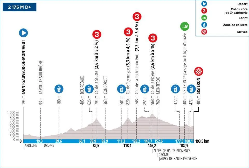 La 5ᵉ étape de ce Paris-Nice relie Saint Sauveur de Montagut et Sisteron. 193,5 kilomètres de perpétuelles montées et descentes. Une étape potentiellement destinée à un baroudeur partie dans l’échappée matinale. Un milieu d’étape assez vallonné avec l’enchainement du col de Peyruergue (5,3 kilomètres à 4,9% de moyenne), la Côte de La Rochette du Buis (2,3 kilomètres à 5,4% de moyenne) et le col de la Pigière (2,6 kilomètres à 5% de moyenne). Le final est relativement plat avec un faux plat descendant à 8 kilomètres de l’arrivée.