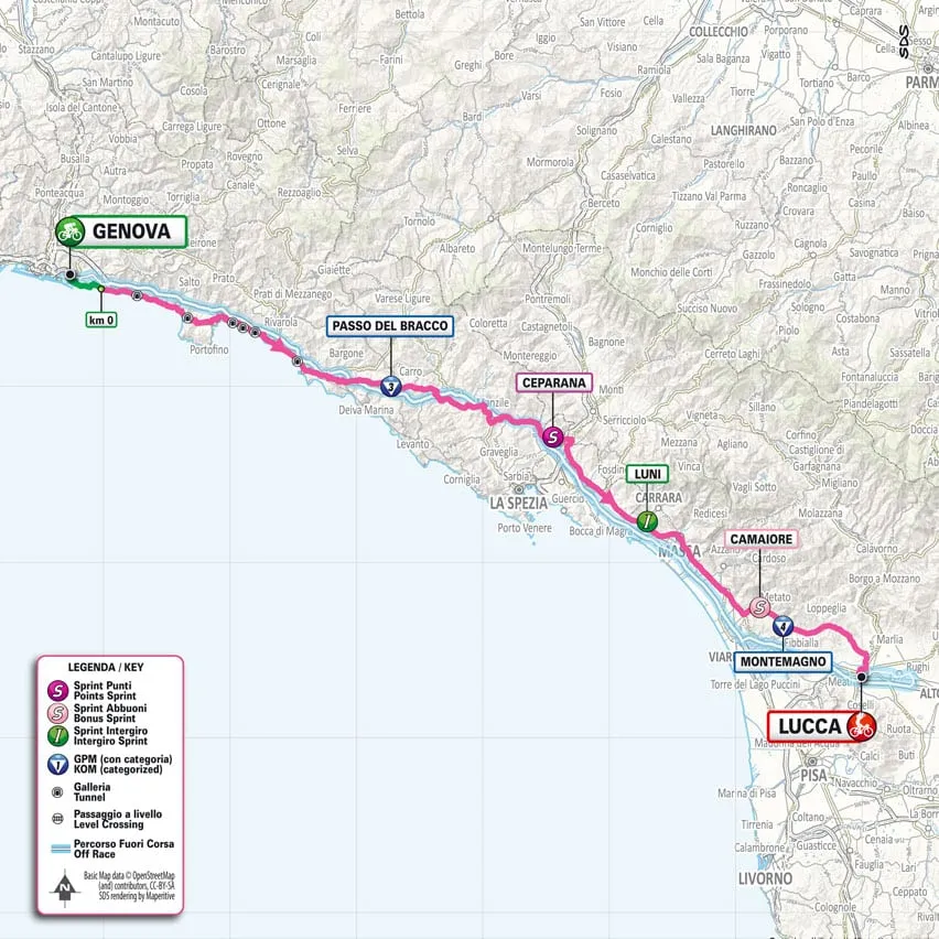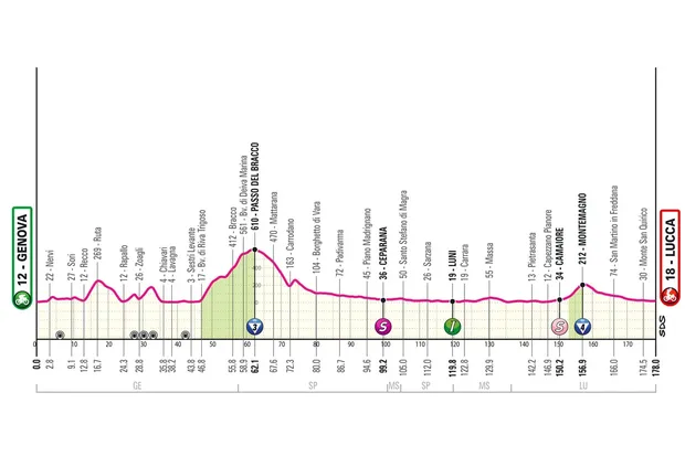 Ce mercredi pour cette 5ᵉ étape de ce Giro 2024 le peloton va devoir rallier Lucca depuis Gênes en 178 kilomètres. Sur le papier l’étape semble promise aux sprinteurs. La première partie du tracé est assez vallonnée. Les 50 premiers kilomètres seront une succession de montée courte et non répertorié qui pourrait faire mal aux pattes et permettent à une échappée de se former. Après les montées de Ruta (3,7 km à 6,8 %), Rapallo, et la Madonna delle Grazie (3,9 km à 4 %), le peloton se dirigera vers le Passo Del Bracco (15,3 kilomètres à 3.9 % de moyenne). Une longue ascension avec des passages jusqu’à 7 % de moyenne, mais qui semble trop loin de l’arrivée pour faire une différence.