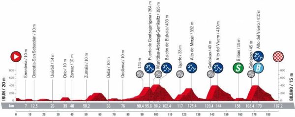- Il y aura cinq difficultés au programme, le col de Gontzagarinaga (5.3 km à 4.5%), au km 95.6, le col de Bizkaia (4.2km à 5.6%) au km 102.4, l'Alto de Morga (8.6km à 3.5%) au km 125.4, .