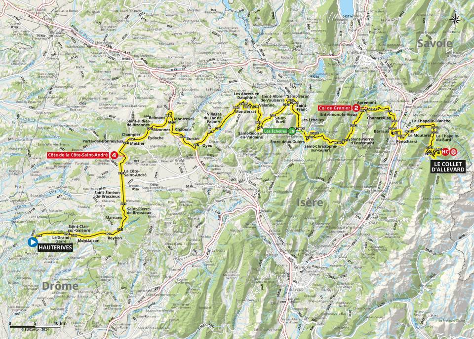 Cette antépénultième étape partira de la Drôme dans la commune de Hauterives. Un petit village de 1887 habitants. Le peloton se rendra donc l'Isère vers le Collet d'Allevard. Le départ sera donné à 12 h 55 et l'arrivée se fera aux alentours de 17 h 00.