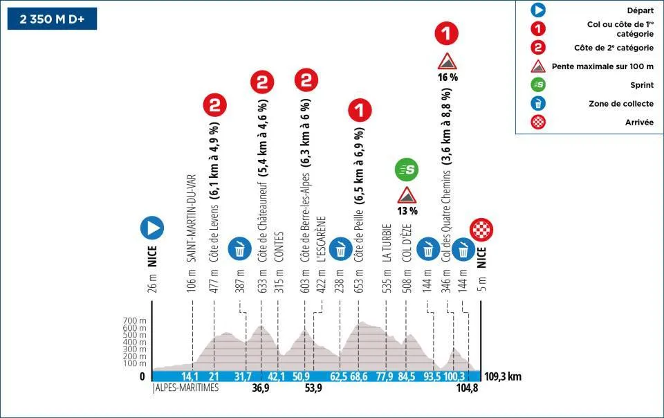 Dernière étape de ce Paris-Nice 2024 relie Nice à Nice. Étape courte de 109,3 kilomètres avec plus de 2350 mètres de dénivelé positif. Au programme 5 ascensions dans cette journée qui va compter pour le classement général ainsi que pour le classement de la montagne. Le final se déroule en deux parties. La montée du col des Quatre Chemins (3,6 kilomètres à 8,8% de moyenne) puis la descente et l’arrivée sur Nice.