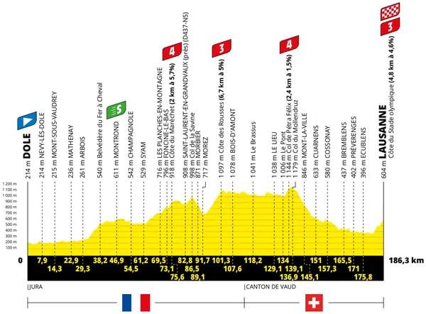 Il y aura 2500 mètres de D+, mais l’effort gagnant sera sans aucun doute l’ascension finale. Tout au long de la journée, le peloton traversera trois ascensions catégorisées, et le sprint intermédiaire qui les précédera assurera également de l’action. La journée se terminera dans la ville de Lausanne, au bord du lac, près du stade olympique. Ce sera une finale explosive, où plusieurs types de coureurs pourront s’épanouir. La montée finale est de 4,8 kilomètres au total avec une pente moyenne de 4,6%, mais cela ne dit pas tout.