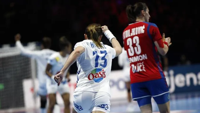 Les serbes dominent physiquement et imposent un rythme très intense cependant Estelle Nze Minko, trés percutante, maintient la France dans un dynamique positive. Les Bleues réussissent à exploiter le jeu sur grand espace, avec des contre-attaques sur les dernières minutes. Sur une dernière parade de Laura Glauser, les Bleues entrent au vestiaire sur le score de 18 à 14.