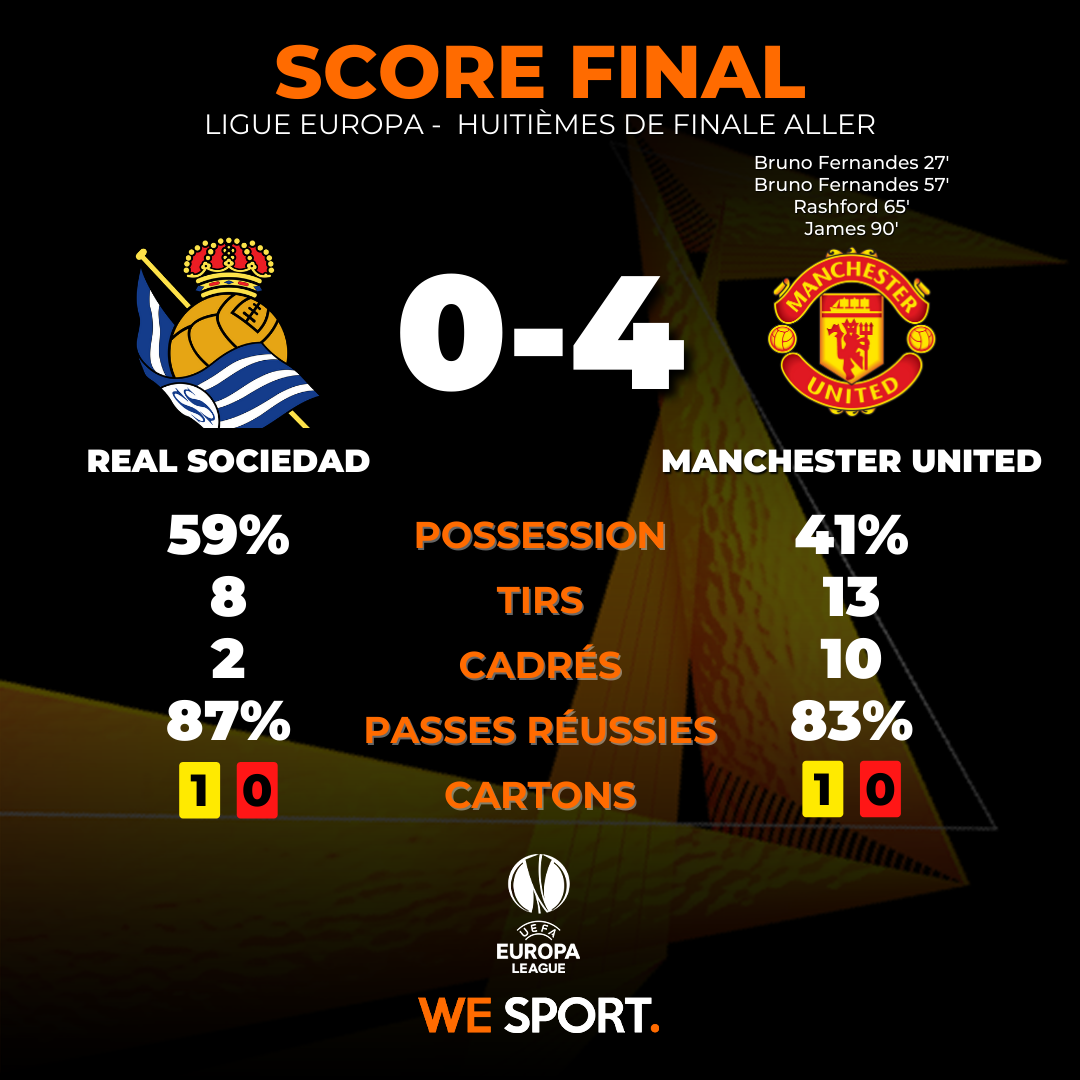 Après la pause, les espagnols mettent le pied sur le ballon pour tenter de faire déjouer le très rigoureux bloc mancunien. Mais il n'aura suffit que d'une seule occasion pour ces derniers afin de doubler la mise. Malgré une joie différé suite à un check de l'arbitrage vidéo, Bruno Fernandes s'offre un doublé et permet aux siens de faire le break. Après l'heure de jeu, Fred lance Rashford dans la profondeur et après deux échecs, il parvient à tromper Remiro avec un plat du pied côté ouvert, 3-0 pour United. L'avant-centre des Reds Devils vient d'inscrire son 7e but en 7 matchs européens cette saison. Juste avant la fin du match, Daniel James s'ajoute à la liste des buteurs du soir.