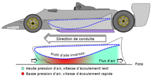 En sport auto, c'est le phénomène inverse qui est recherché. En effet, en retournant l'aile on crée de la déportance. Ce qui permet d'augmenter considérablement l'appui. Pour réaliser cela, on crée des tunnels (dits tunnels “Venturi”) au niveau des pontons des F1 pour permettre à l'air de circuler. Et de créer de l'appui !