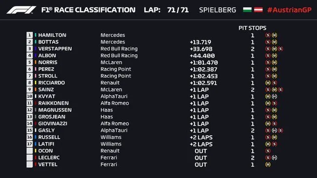 Lewis Hamilton vient de remporter une dominante victoire au GP de Styrie. Il remporte son 85e succès en carrière, devant son équipier Bottas et Max Verstappen.