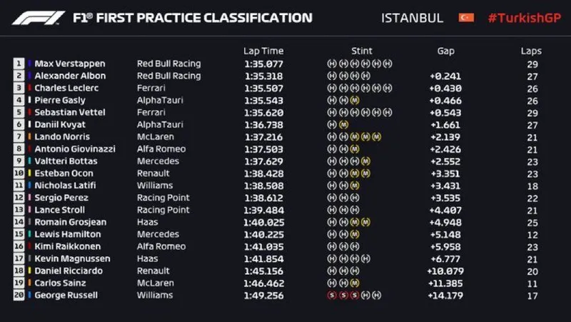 La F1 se prend pour le Trophée Andros à l’Istanbul Park. C’est comme cela que l’on peut résumer la première journée d’essais de F1 sur le tracé stanbouliote. Et dans ces conditions, c’est Max Verstappen qui a su tirer son épingle du jeu. En se montrant le plus rapide, le Batave a montré qu’il pouvait prétendre à la victoire sur ce tracé. Surtout que ses opposants directs, les Mercedes de Bottas et Hamilton, n’arrivent pas à trouver le grip nécessaire pour faire fonctionner leur W11.