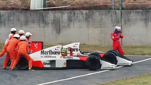 - 1990: Senna part en pole du coté sale de la piste. Il manque une nouvelle fois son départ. Prost lui passe devant au premier virage… Mais les deux hommes n’iront pas plus loin. Senna heurte délibérément l’arrière de la Ferrari du français et envoie les 2 voitures dans le décor. Qu’importe pour le brésilien. Il est vengé de l’année passée et sacré champion.