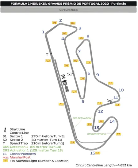 L’occasion de montrer son superbe tracé, très vallonné. Composé de 15 virages, l’Autodromo de Portimão offre son lot de virages très techniques. Comme le freinage du T1, tout en descente. Ou l’enchainement 10-11, avec un point de corde sur une bosse, donc complètement en aveugle. Le tracé de 4.653 km possède aussi deux zones de dépassement: la ligne droite des stands (de près d’1km), où il y aura le DRS, et la ligne droite oposée entre le T4 et le T5. Tracé ultra moderne, il possède une largeur de piste moyenne de 14m, avec son maximum sur la ligne droite des stands (18m).
