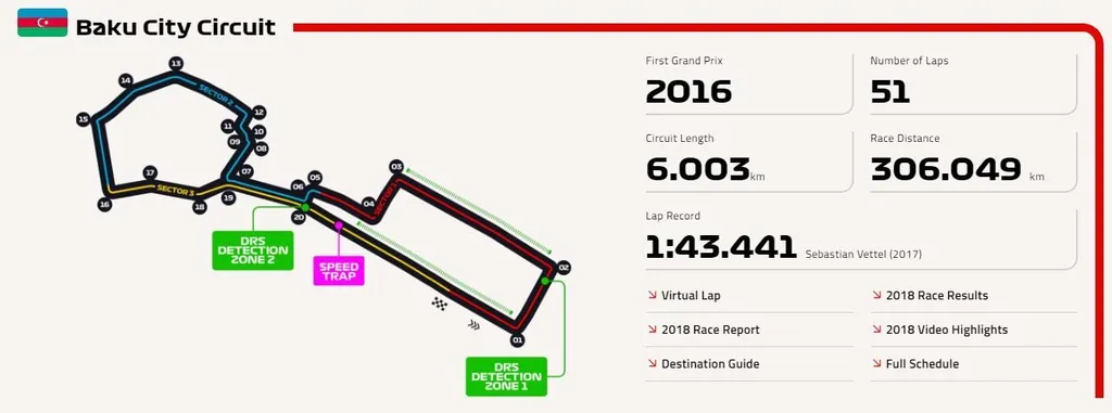 Le circuit d’Azerbaïdjan a accueilli la Formule 1 pour la première fois en 2016. La dernière édition a été marqué par la victoire de Lewis Hamilton et les abandons français d’Ocon et de Grosjean. Depuis son apparition, le grand prix a connu trois vainqueurs: Nico Rosberg (1 victoire), Daniel Ricciardo (1victoire) et Lewis Hamilton (1 victoire). Toutefois, c’est Sebastian Vettel qui est le détenteur du record du circuit avec un chrono de 1:43.441.