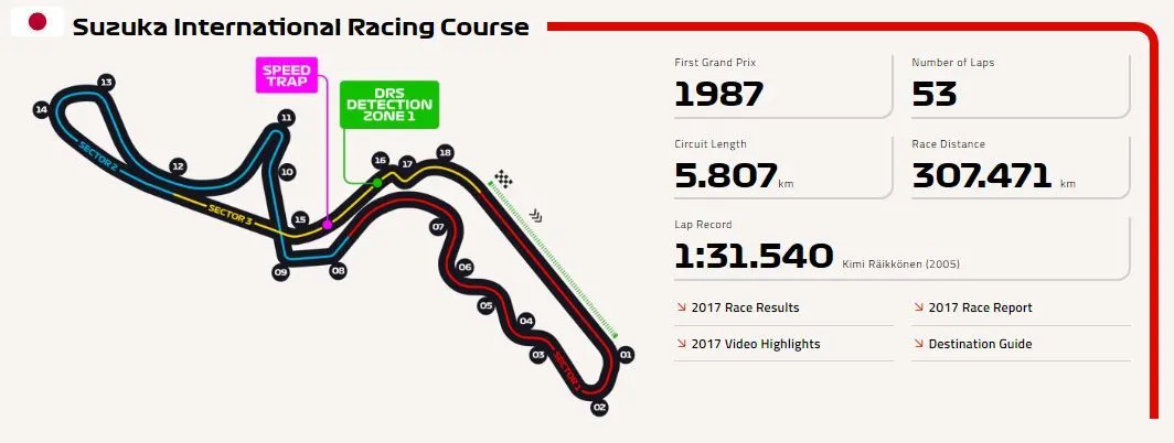 Le circuit de Suzuka a accueilli la Formule 1 pour la première fois en 1987. L’histoire récente du circuit a été marqué par le très grave accident de Jules Bianchi en 2014 qui décédera 9 mois plus tard, des suites de ses blessures. Depuis 2009 seulement 4 pilotes ont remporté le grand prix de Suzuka: Sebastian Vettel (4 victoires), Lewis Hamilton (2 victoires), Jenson Button (1 victoire) et Nico Rosberg (1 victoire)