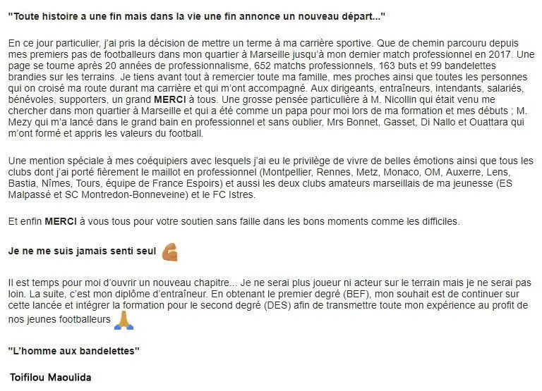 Ca y est c’est officiel ! Comme il l’a lui-même annoncé sur son compte twitter ce vendredi 8 juin, jour de son anniversaire, Toifilou Maoulida raccroche les crampons ! L’homme aux bandelettes met un terme à sa carrière après 20 années sur les terrains.