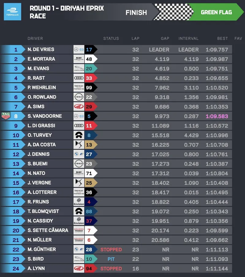 Nyck de Vries (Mercedes-EQ) s’impose dans la première course de la saison à Diriyah, en Arabie Saoudite. Eduardo Mortara (Venturi) et Mitch Evans (Jaguar) complètent le podium.