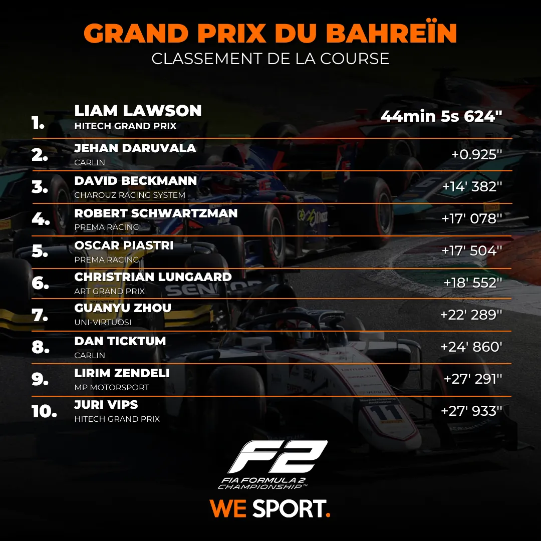 Pour la première course de la saison sur le circuit de Sakhir, Liam Lawson l’a emporté avec maîtrise. Le pilote Hitech GP devance sur la ligne, Jehan Daruvala et David Beckmann. Théo Pourchaire, longtemps deuxième, a été contraint à l’abandon à cause d’une problème moteur.