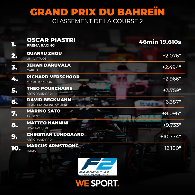 Le programme était chargé aujourd’hui à Sakhir. Après leur 1re course ce matin, les pilotes avaient de nouveau rendez-vous sur la piste. Pour ce 2e sprint de la journée, c’est le néophyte Oscar Piastri qui s’est imposé devant Zhou et Daruvala. Théo Pourchaire se classe 5e.