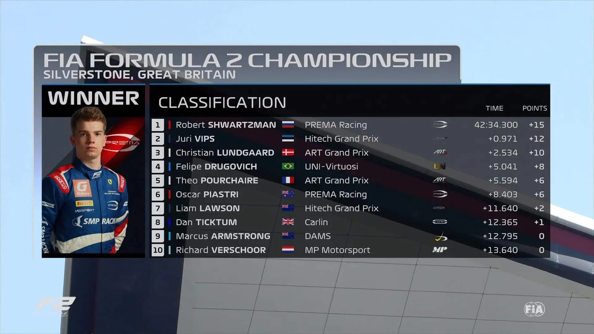À Silverstone alors que le public rêvait d’une victoire britannique, c’est l’hymne russe qui a finalement retenti. Le pilote Prema Robert Shwartman, parti quatrième, a mené la course de bout en bout pour célébrer sa deuxième victoire de la saison. Jüri Vips et Christian Lundgaard complètent le podium. Le Français Théo Pourchaire finit cinquième, un mois après s’être fracturé le radius.