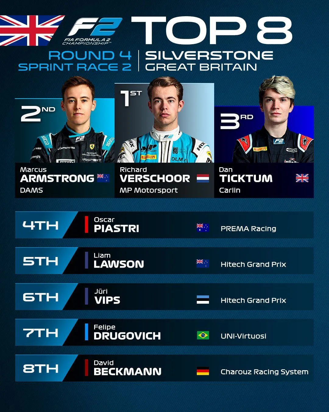 La course se conclut plus tranquillement, Verschoor s’impose devant Armstrong et Ticktum, alors que Piastri s’adjuge le point du meilleur tour.