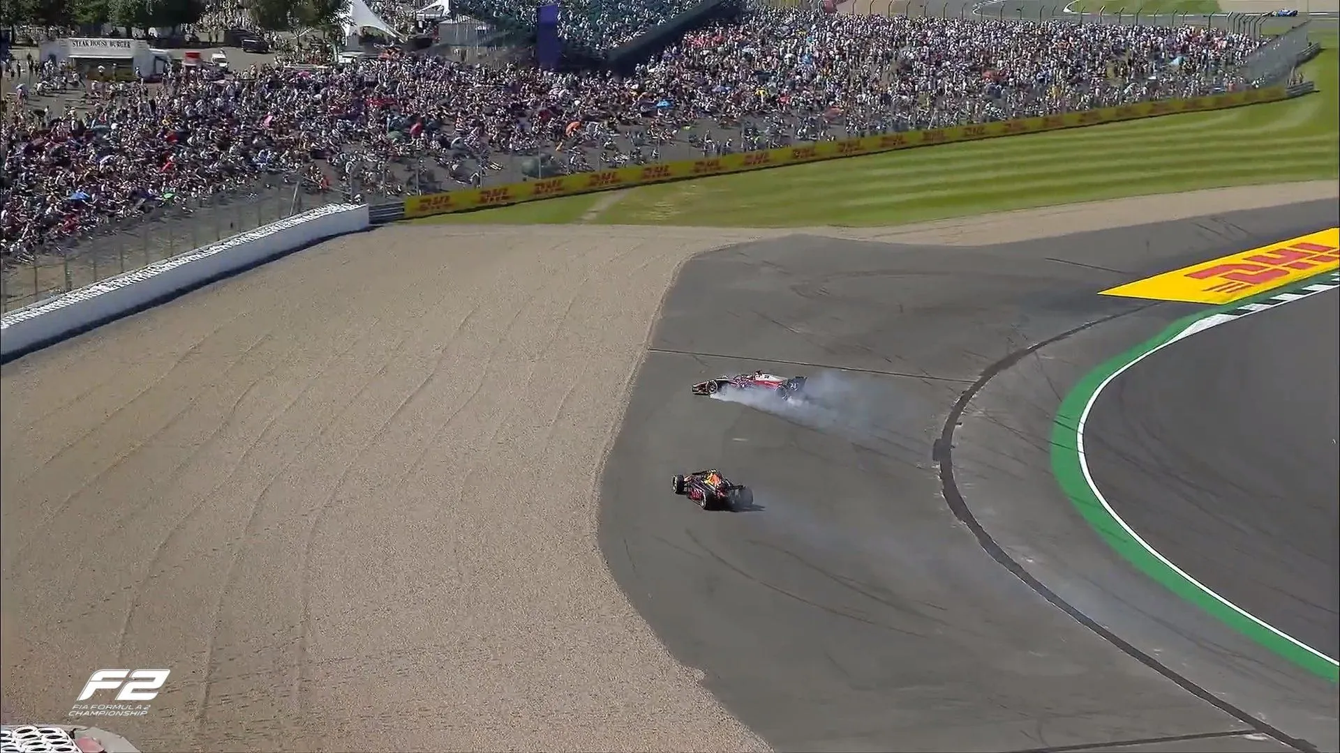Mais, au sixième tour, bis repetita, nouveau contact, cette fois-ci entre Daruvala et Viscaal dans Stowe, la voiture de sécurité ressort. Après un passage au stand, des changements de pneus et d’aileron avant, l’Indien repart en dernière position. Dans la foulée, il écope de 10 secondes de pénalité pour “avoir causé une collision”.