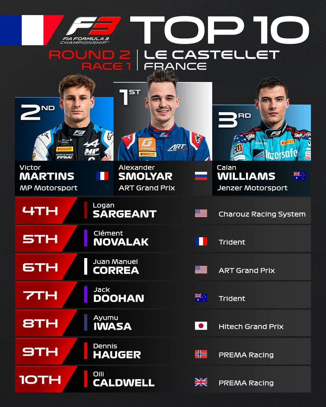 Le samedi matin, pour la première fois de sa de la saison, l’Australien, Calan Williams s’élançait en pole position grâce à sa douzième place en qualification. Mais rapidement le pilote Jenzer Motorsport va voir ses rêves de victoires alors que la meute des cadors pour le titre fonçait droit vers la victoire. À l’issue des vingt boucles, il se classe à une splendide troisième place juste derrière deux fusées : Aleksandr Smolyar et Victor Martins. Le premier remporte une nouvelle fois la course d’ouverture comme il l’avait fait à Barcelone, le second exulte à domicile devant une foule en liesse après être parti de la dixième place. Mais s’il y a bien un homme à retenir de la première course, il s’agit d’Arthur Leclerc. Partant dernier après un problème en qualification, le Monégasque a fait parler sa pointe de vitesse. Il finit à une incroyable douzième place et a dépassé plus de la moitié des pilotes en piste.