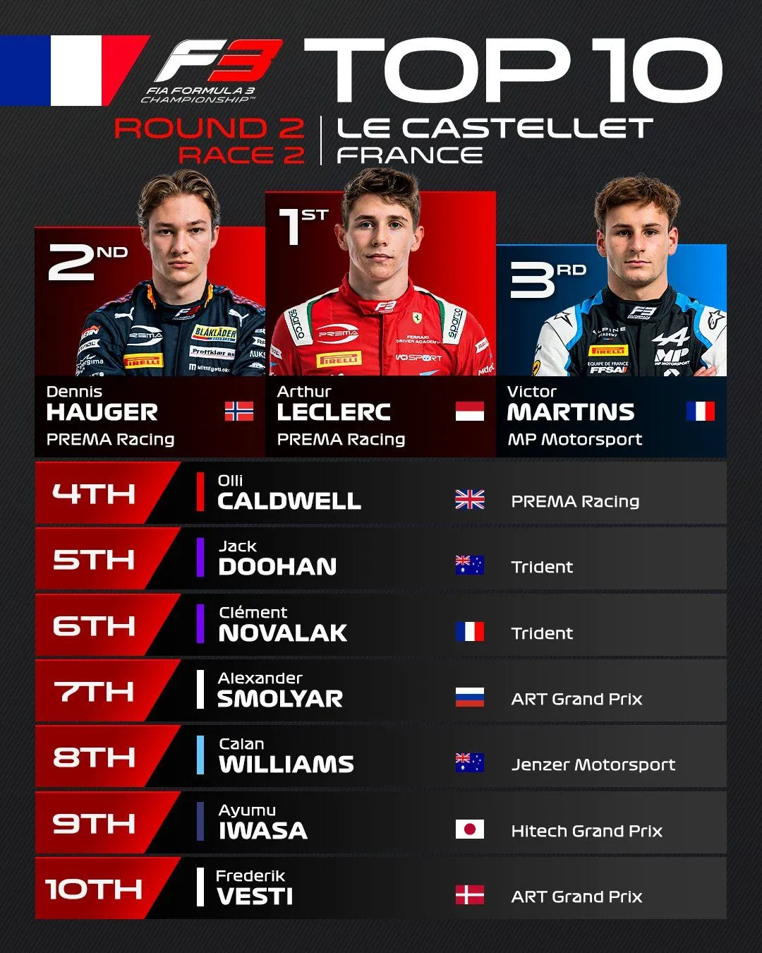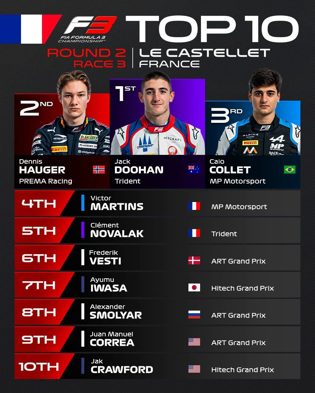 Tout simplement au-dessus des autres pour la dernière épreuve du week-end, l’Australien Jack Doohan remporte lui aussi sa première victoire dans la catégorie. Dennis Hauger et Caio Collet complètent le podium. Arthur Leclerc, démontre une nouvelle fois son talent en remontant à la treizième place alors qu’il s’élançait de la dernière position. Et c’est sous cette pluie que se conclut la deuxième manche du championnat.