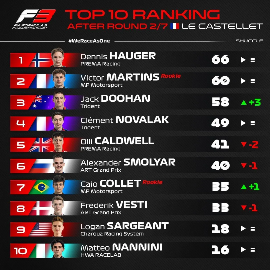 Finalement, après trois courses pleines de suspens, le leader du championnat, Dennis Hauger conserve sa place de leader avec 66 points. Les Français Victor Martins et Clément Novalak se classent respectivement deuxième et quatrième avec 60 et 49 unités. Grâce à sa victoire lors de la dernière course, Jack Doohan passe troisième. Enfin, Arthur Leclerc inscrit ses premiers points de la saison.